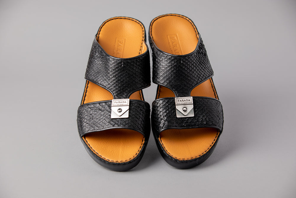 An extremely lightweight and comfortable design and are made of genuine python leather with a rubber sole and a metallic center buckle.